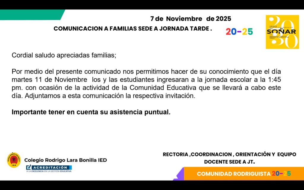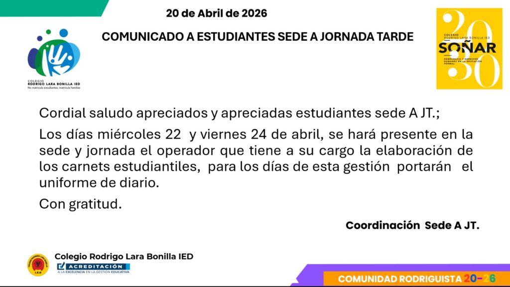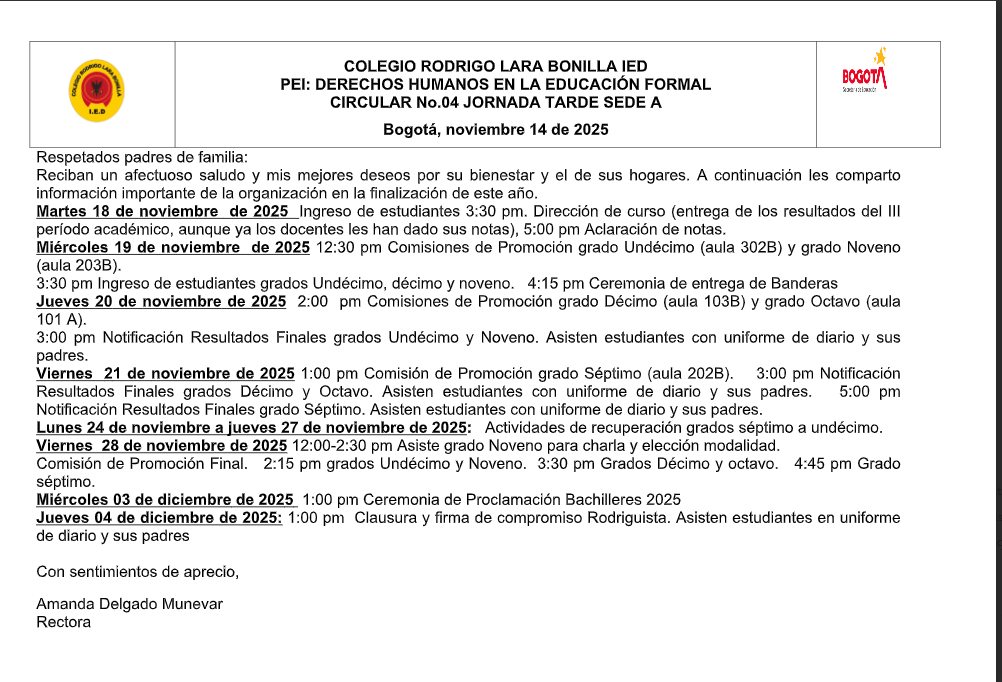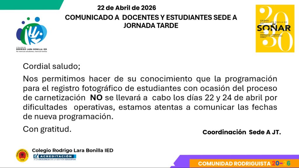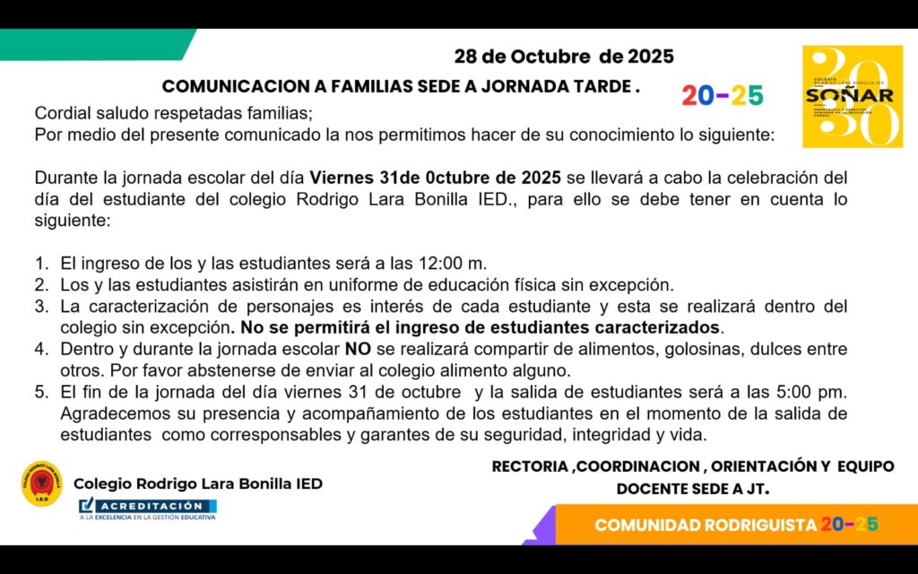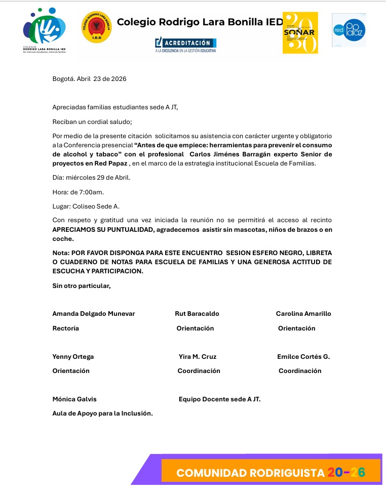 Queridas familias del Colegio Rodrigo Lara Bonilla IED