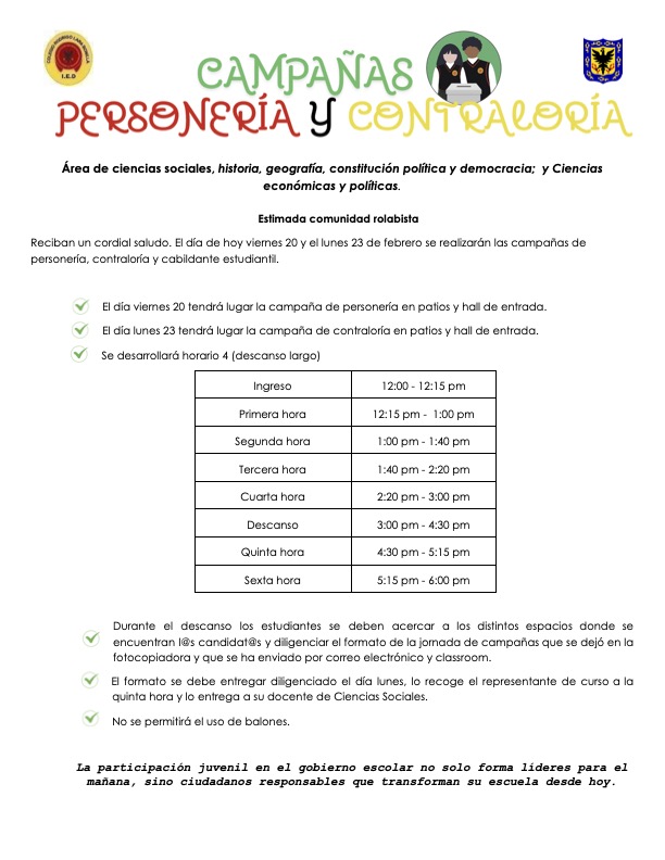 ELECCCIÓN DE PERSONER@, CONTRALOR@ Y CABILDANTE ESTUDIANTIL